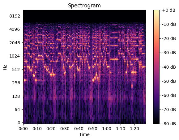 This is not a spectrogram yet. To create the spectrogram, we calculate the FFT on short overlapping time segments. This is known as the short-time Fourier transform, we may now plot these as frequency vs time, alongside a color spectrum. The brighter the color, the greater the magnitude of that particular frequency at that particular time. I used the default settings of the librosa Python library, which calculates FFT over 2048 samples, offset by 512 samples each time.